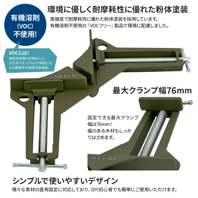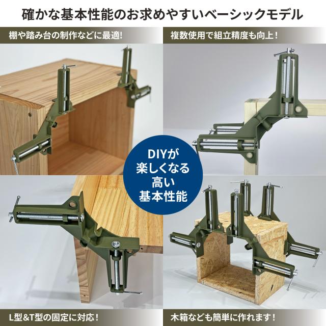 【使用用途】箱物、本棚、収納棚、机の引き出し、額縁、ベンチ、棚受けの制作など、直角での固定が必要な作業に重宝します。直角での接着や釘打ちネジ留めだけでなく、のこぎりでの切断作業時の固定など、幅広い用途で使用可能です。