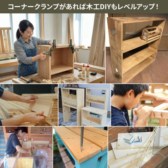 箱物、本棚、収納棚、机の引き出し、額縁、ベンチ、棚受けの制作など、直角での固定が必要な作業に重宝します。直角での接着や釘打ちネジ留めだけでなく、のこぎりでの切断作業時の固定など、幅広い用途で使用可能です。
