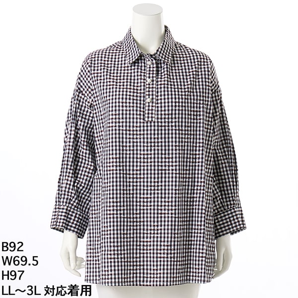 綿100%先染めギンガムチェックに花柄ジャカードを施した素材、ブラウン×ネイビーのギンガムチェック、パール調ボタンがアクセント、チュニック丈スキッパーシャツ