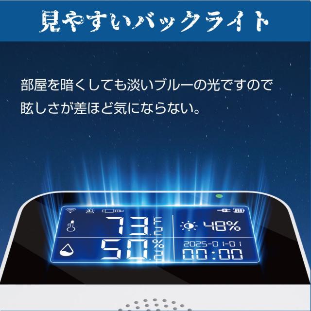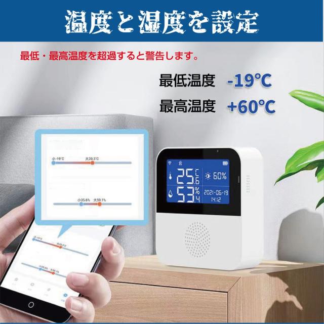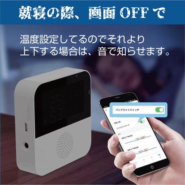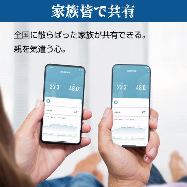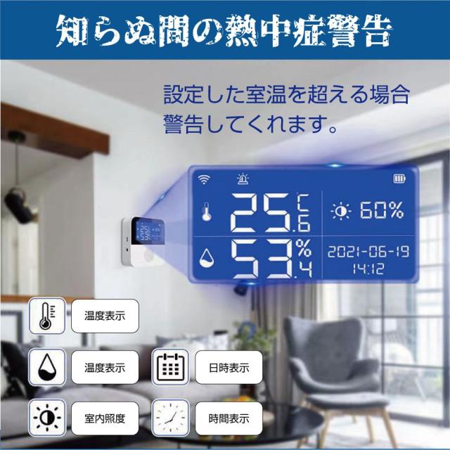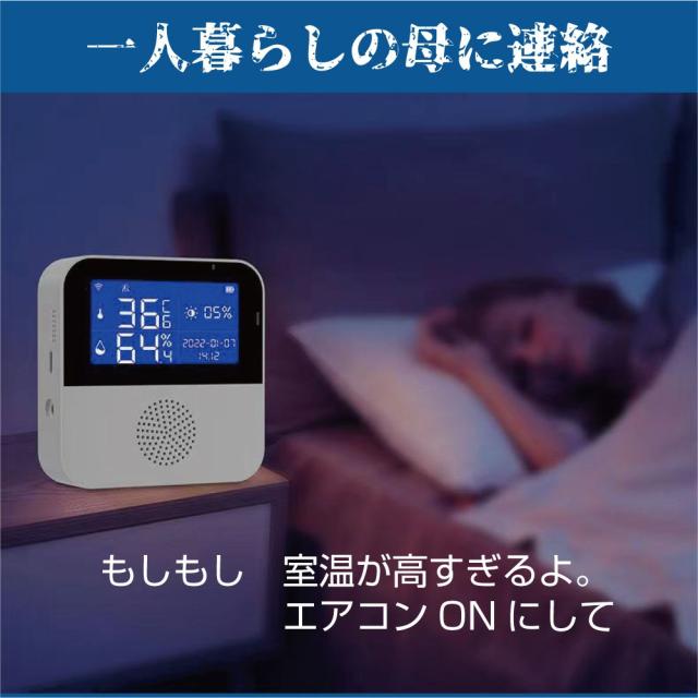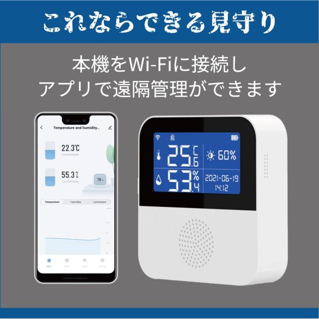 気づかぬ間の熱中症を防ぐ! 設定した室温を超えると警告してくれるサーモハイグロメーターです! 本体をWi-Fiに接続してアプリで遠隔管理ができるので 一人暮らしの両親、扉の閉まった子供部屋など様々な状況で活躍できます。 ▼便利な5つの表示 ・温度 ・湿度 ・室内照度 ・年月日 ・時間 ▼アプリで遠隔確認&管理 Wi-Fiに接続してアプリで管理 最低、最高温度を設定し、超過すると警告します。 ▼見やすいバックライト 淡いブルーで暗い環境でも眩しくなく見やすい。 ▼バッテリー内蔵 バッテリーを内蔵しているので給電しているUSBを外しても満充電時24時間稼働 ▼設置自由度が高い 卓上or壁面の2WAY設置が可能。 |