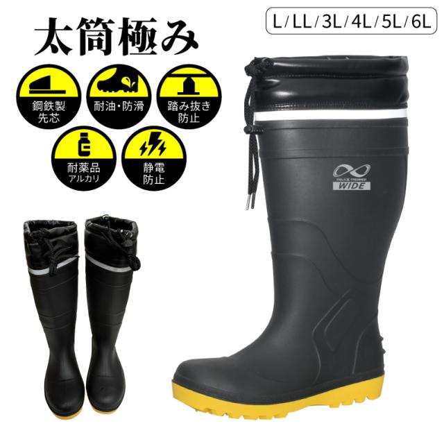 ●従来品よりも履き口が約7cmも広い、約54cmの履き口周り(サイズ4Lの場合) 先芯・踏み抜き防止板を内蔵した長靴。