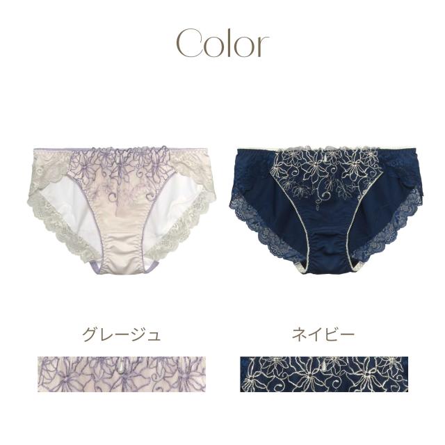 【Furaha Bra】 〜今日のわたしに幸せを運ぶ、いそがしい毎日のお守りブラ〜 日々を生きる自分自身に寄り添い、自信を高めるインナーシリーズです。 ------------------------------ FurahaBraシリーズ [waltz] のコーディネートショーツです。 ■デザイン 線画調のクレマチス刺繍をあしらったシックなデザイン。 パールを飾り可愛らしさと上品さも兼ね備えた一着に。 脚口にはレースをあしらい、響きにくさも可愛らしさもプラス。 お尻を優しく包み込む、安心のフルバックタイプ。 響きにくいので、タイトなボトムスやワンピースにもおすすめです◎ ■カラーバリエーション 淡いくすみカラーが大人可愛い【グレージュ】と、 刺繍が映えるシックな【ネイビー】の2色展開です。 ■サイズ S〜5Lと幅広いサイズ展開で、様々な体型の方に着用していただけます。