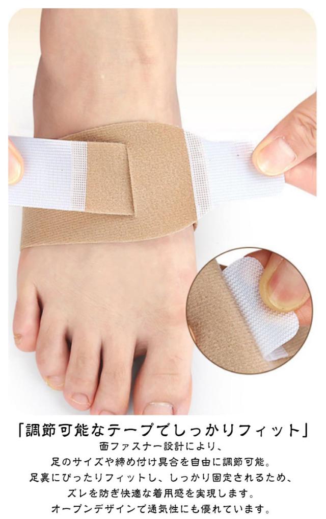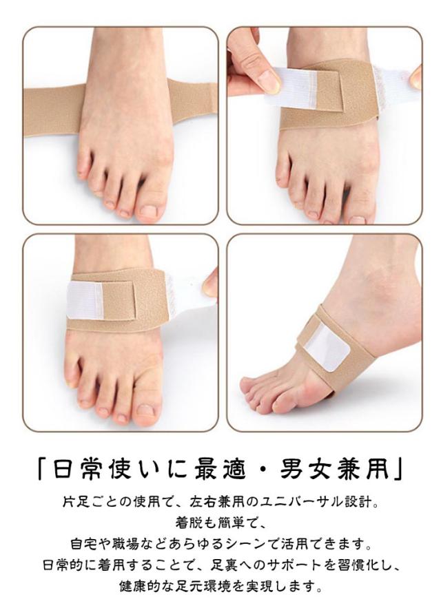 | 「足裏サポートで健康な歩行をサポート」 「足弓サポートインソール」は、土踏まずのアーチをしっかり支え、足裏の負担をやわらげるサポーターです。 扁平足や足弓のくずれによる足裏痛にお悩みの方に最適。 毎日の歩行や立ち仕事をサポートし、快適な足元環境を提供します。 「調節可能なテープでしっかりフィット」 面ファスナー設計により、足のサイズや締め付け具合を自由に調節可能。 足裏にぴったりフィットし、しっかり固定されるため、ズレを防ぎ快適な着用感を実現します。 オープンデザインで通気性にも優れています。 「カーブ形状が足裏にフィット」 足裏の自然な曲線に合わせたカーブ形状設計で、足弓を的確にサポート。 土踏まずがしっかり持ち上げられ、歩行時の衝撃を吸収。 「日常使いに最適・男女兼用」 片足ごとの使用で、左右兼用のユニバーサル設計。 着脱も簡単で、自宅や職場などあらゆるシーンで活用できます。 日常的に着用することで、足裏へのサポートを習慣化し、健康的な足元環境を実現します。 「安心してお使いいただけます」 シンプルなブラックカラーでどんな靴にも合わせやすく、足元の悩みをスタイリッシュにカバー。 ご自宅でのリラックスタイムから外出時のサポートまで、幅広いシーンに対応します。 | |