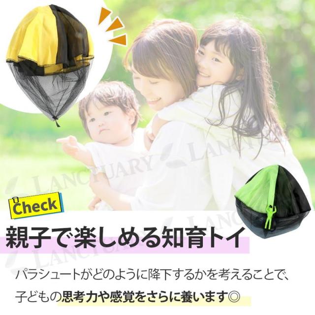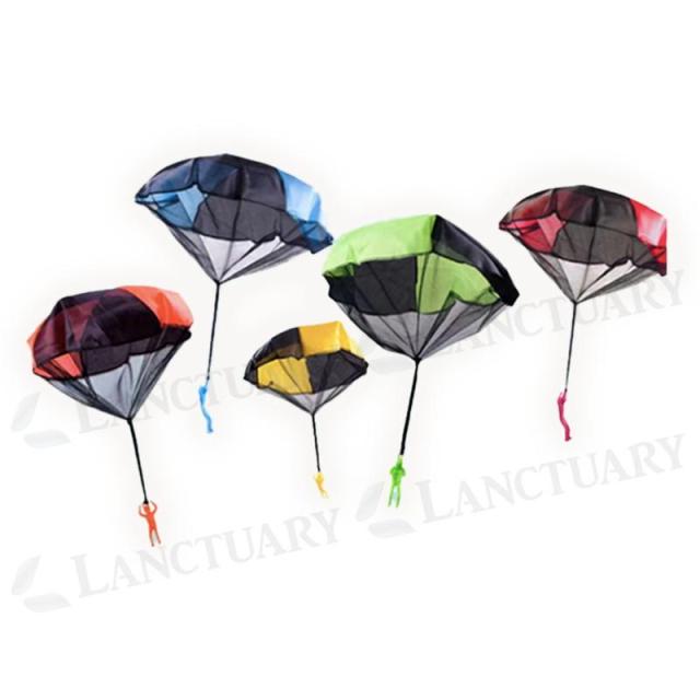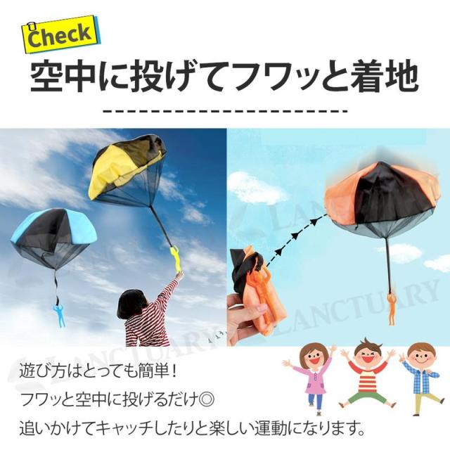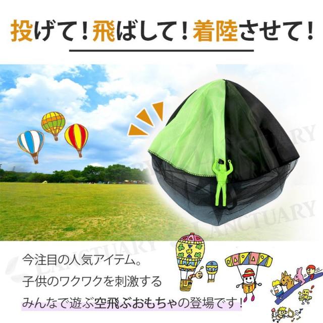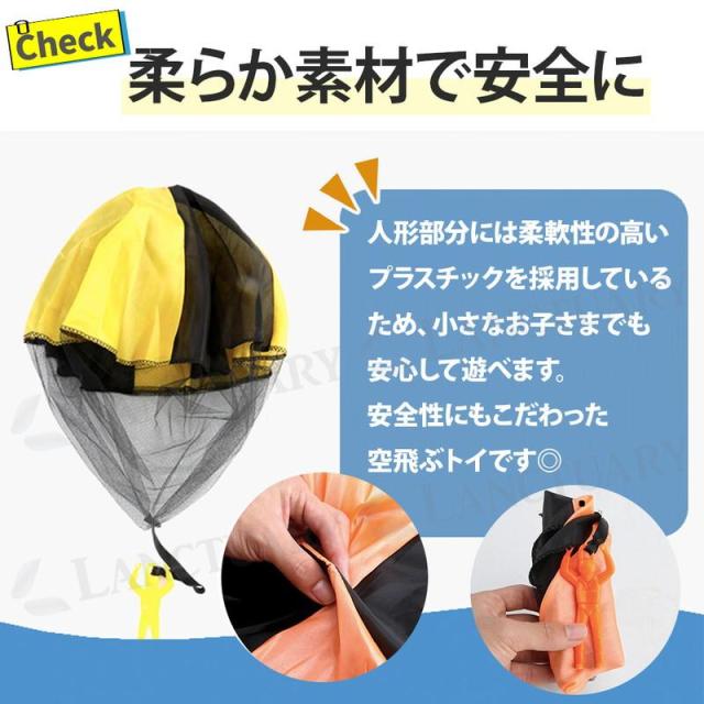遊び方は簡単です。投げて飛ばして上手く着地させてください。着地地点まで追いかけてキャッチしたりと軽い運動もできちゃいます。子供のワクワクを刺激する今注目のおもちゃです。気分の上がる元気カラーと人形が本物のパラシュートを連想し子供の好奇心をそそります。素材は柔らかなプラスチックでできており、小さなお子様でも安心してご使用いただけます。また、人形がどうやって降りていくかや、上手く着地させるにはどうすればいいかなど考える力や感覚などをもっと養うことができます。お子様と一緒に考え遊び有意義な時間を過ごせます。