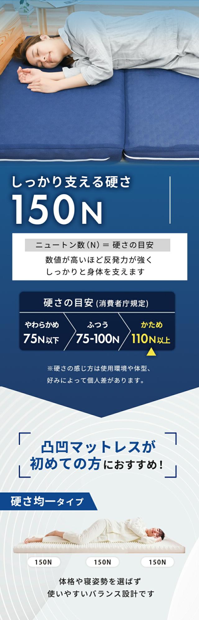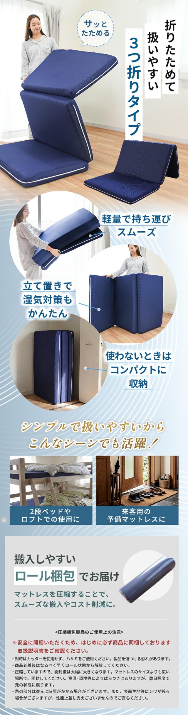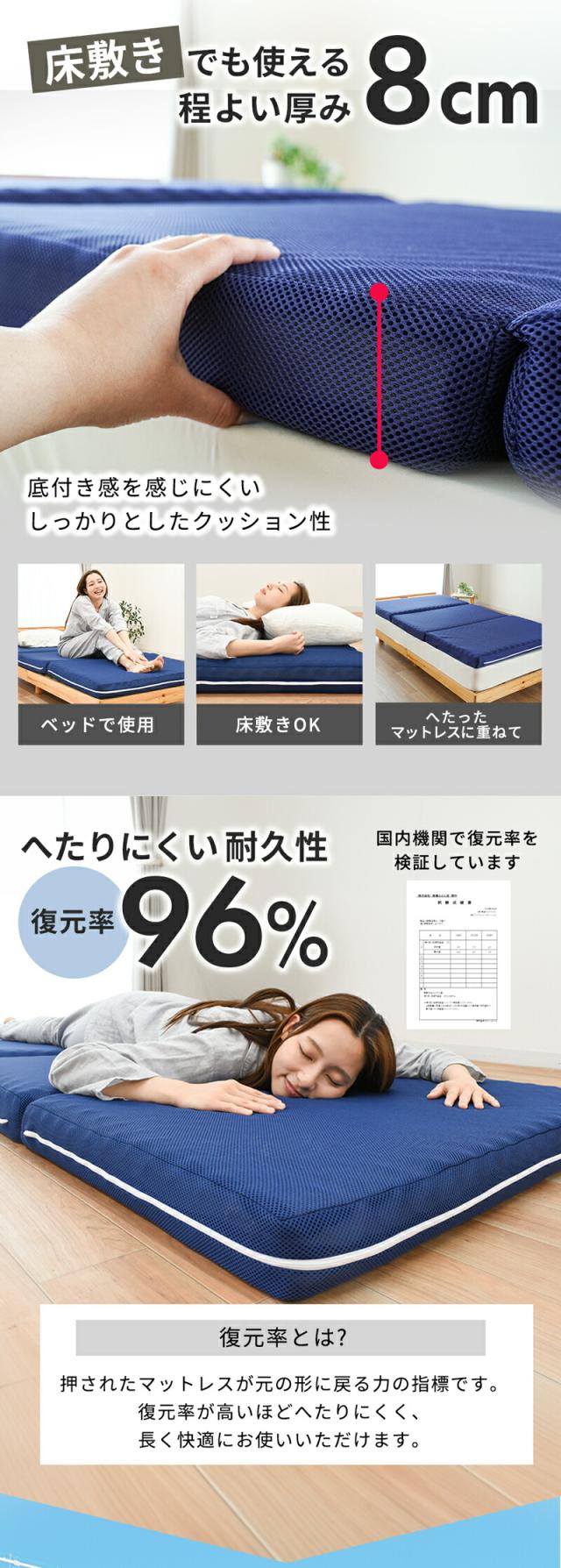 | ・国内自社工場から安心の眠りをお届け 高品質な国産ウレタンフォームを使用。 (硬さ均一タイプ) 高い反発力・程よいクッション性で寝返りをサポート。寝返りをすることで血行を促し、身体の負担を軽減。湿気も発散してくれます。 ・理想的な寝姿勢をキープする形状一つ一つの「点」が優しく全身を支えてくれます。この形状で身体に合わせて体圧分散し、立ち姿に近い理想の寝姿勢をキープします。 ・底付き感のないしっかりとした寝心地床に直接敷いても底付き感がなく、しっかりとしたクッション性のある寝心地です。 側生地はサラッとした肌触りで通気性が抜群のメッシュ素材を使用。側面にはファスナーが付いているため、外して丸洗いが可能。 折りたたみ簡単な三つ折りタイプ。立てかけて湿気対策ができます。コンパクトに収納できるので来客用にもおすすめです。ロフトや2段ベッドなど高い位置への持ち上げにも軽量で使いやすい仕様です。 ・搬入しやすいロール梱包でお届けマットレスを圧縮することで、スムーズな搬入やコスト削減に。 | |