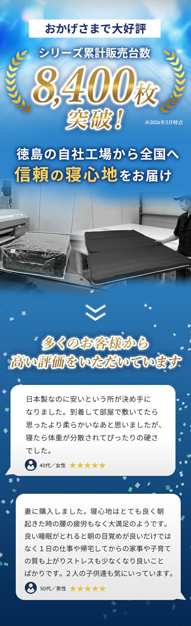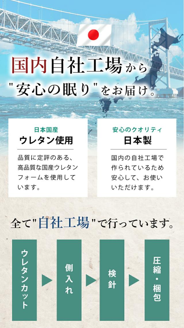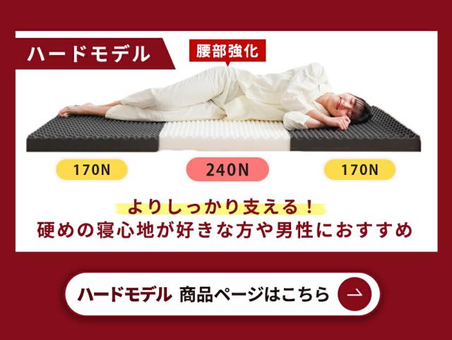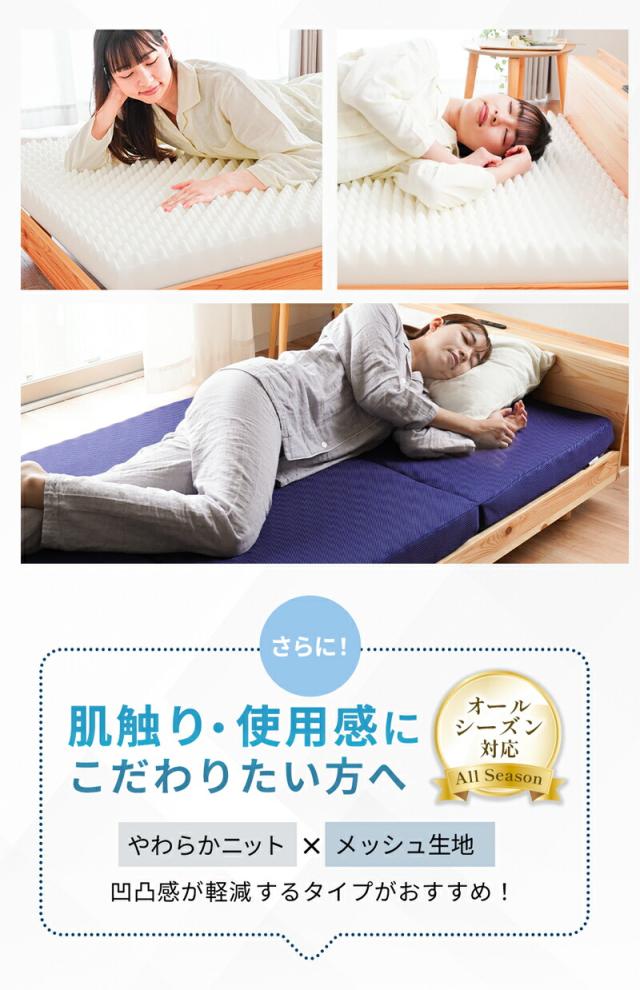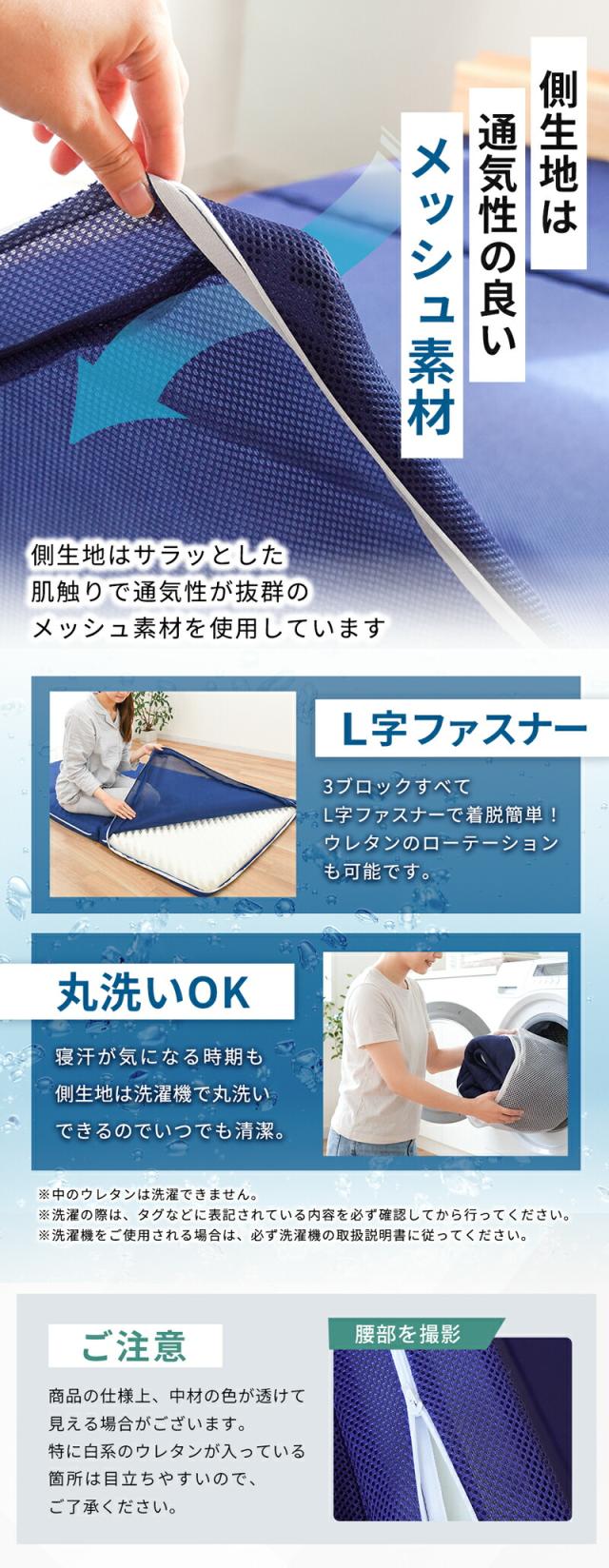 | ・国内自社工場から安心の眠りをお届け 高品質な国産ウレタンフォームを使用。 (硬さ均一タイプ) 高い反発力・程よいクッション性で寝返りをサポート。寝返りをすることで血行を促し、身体の負担を軽減。湿気も発散してくれます。 ・理想的な寝姿勢をキープする形状一つ一つの「点」が優しく全身を支えてくれます。この形状で身体に合わせて体圧分散し、立ち姿に近い理想の寝姿勢をキープします。 ・底付き感のないしっかりとした寝心地床に直接敷いても底付き感がなく、しっかりとしたクッション性のある寝心地です。 側生地はサラッとした肌触りで通気性が抜群のメッシュ素材を使用。側面にはファスナーが付いているため、外して丸洗いが可能。 折りたたみ簡単な三つ折りタイプ。立てかけて湿気対策ができます。コンパクトに収納できるので来客用にもおすすめです。ロフトや2段ベッドなど高い位置への持ち上げにも軽量で使いやすい仕様です。 ・搬入しやすいロール梱包でお届けマットレスを圧縮することで、スムーズな搬入やコスト削減に。 | |