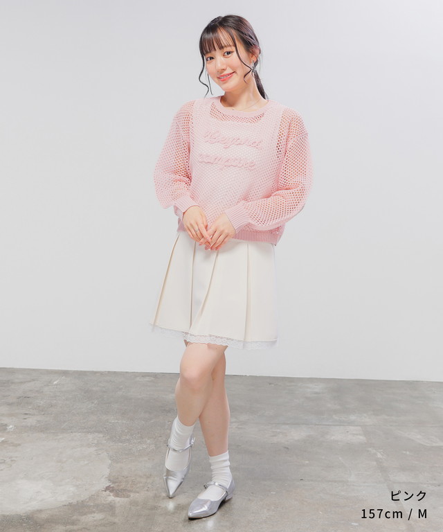 トップス ニット セーター 長袖 メッシュ編み コード刺繍 ショート丈 綿混 クルーネック レディース Honeys ハニーズ コード刺繍メッシュニット