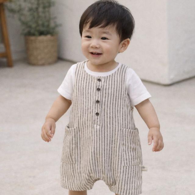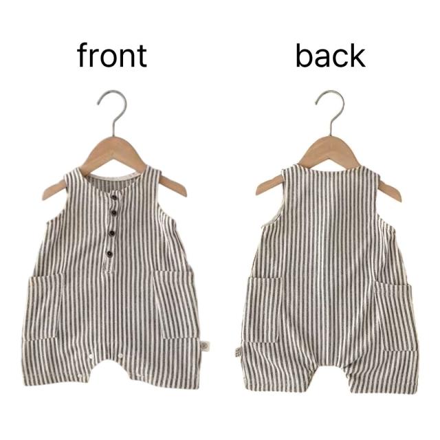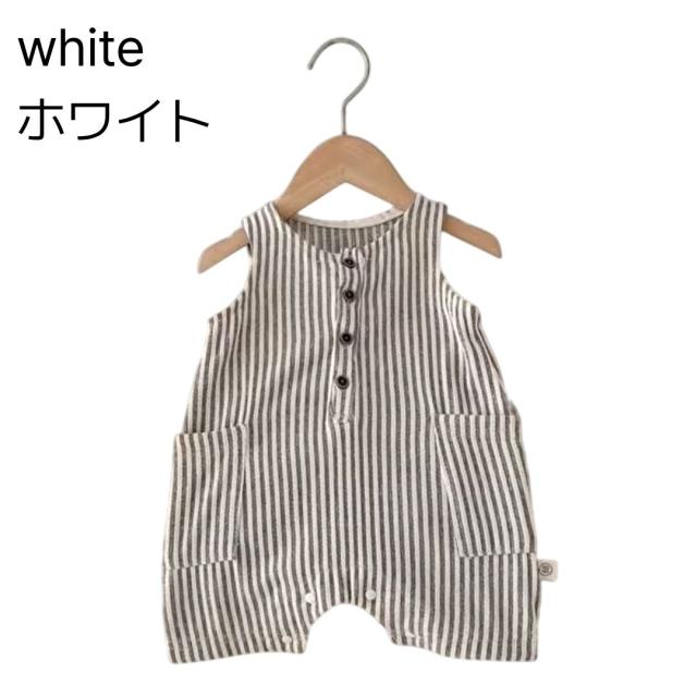 ・特徴:春〜夏向けのノースリーブロンパース、カジュアルなストライプ柄