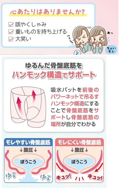・吸水パットを前後のパワーネットで吊るすハンモック構造にすることで骨盤底筋をサポートし骨盤底筋の場所が自分で分かる。