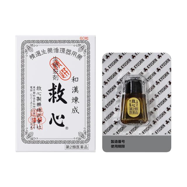 【商品説明:】●どうき、息切れ、気つけに●救心は9つの動植物生薬が協力的に作用し、すぐれた効き目を発揮します。●古来、強壮生薬として知られている「鹿茸」、鎮静作用がある「沈香」を新たに配合。さらに「牛黄」を増量することで、ストレスの多い現代人により役立つ処方としました。●身体がだるくて気力が出ないときや、暑さなどで頭がボーッとして意識が低下したり、めまいや立ちくらみがしたときの気つけにも救心は効果を発揮します。●すぐれた効果を発揮できるように配合が考えられております。●服用しやすい小さな丸剤で、崩壊性にすぐれ、薬効成分がすみやかに吸収されるよう工夫されております。【用法・用量:】・次の1回量を、朝夕および就寝前の1日3回水またはお湯で服用すること大人(15才以上)・・・2粒15才未満・・・服用しないこと※口の中や舌下にとどめたり、かんだりしないこと(このようなのみ方をすると、成分の性質上、舌や口の中にしびれ感がしばらく残ります。)【内容量:】60粒【製造販売元(会社名):】救心製薬