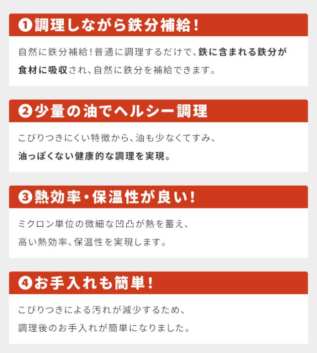 | ・調理しながら自然に鉄分補給 ・槌目加工で油なじみが良く、こびりつきを軽減 ・28cm深型で炒め物や中華料理に最適 ・IH、ガス火の両方に対応したオール熱源仕様 ・燕三条の金属加工技術を活かした日本製 |