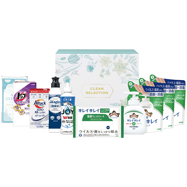 ●ライオン キレイキレイ薬用液体ハンドソープ250ml(本体)×1、ライオン キレイキレイ薬用液体ハンドソープ200ml(詰替)×3、ライオン キレイキレイ除菌ウェットシート10枚(アルコールタイプ)×1、P&G 除菌ジョイコンパクト170ml×1、ライオン Magica除菌プラス220ml×1、ライオン トップクリアリキッド抗菌2P×1、花王 アタックZEROワンパック70g×1、ネットクリーナー1P×1