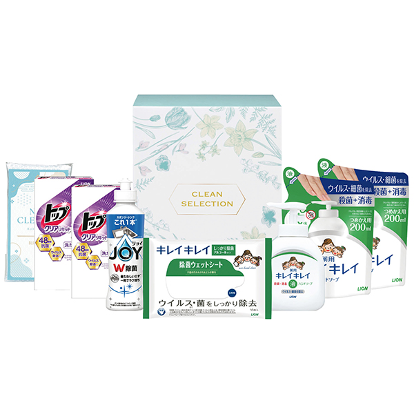●ライオン キレイキレイ薬用液体ハンドソープ250ml(本体)×1、ライオン キレイキレイ薬用液体ハンドソープ200ml(詰替)×2、ライオン キレイキレイ除菌ウェットシート10枚(アルコールタイプ)×1、P&G 除菌ジョイコンパクト170ml×1、ライオン トップクリアリキッド抗菌2P×2、ネットクリーナー1P×1