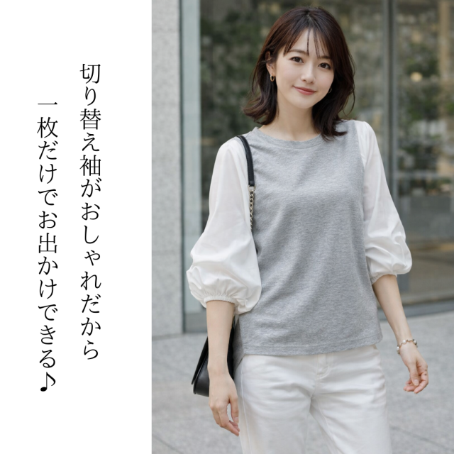 袖の切り替えデザインがおしゃれな「切り替えブラウス」です。