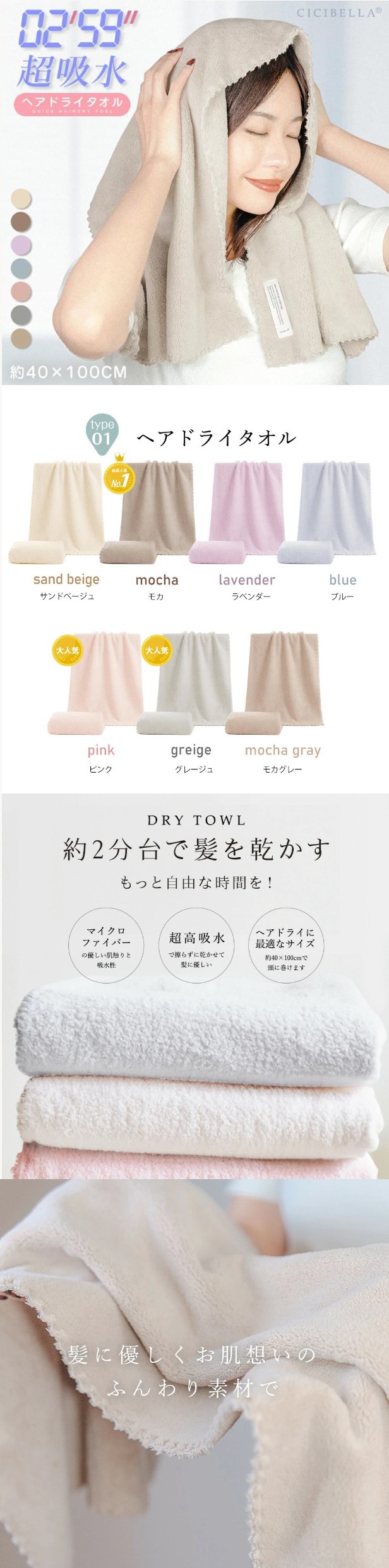 【選べる5色】CICIBELLA ヘアドライタオル 全7色 タオル マイクロファイバー 超高吸水 洗顔 吸水タオル ヘアドライ 速乾 シシベラ 夏