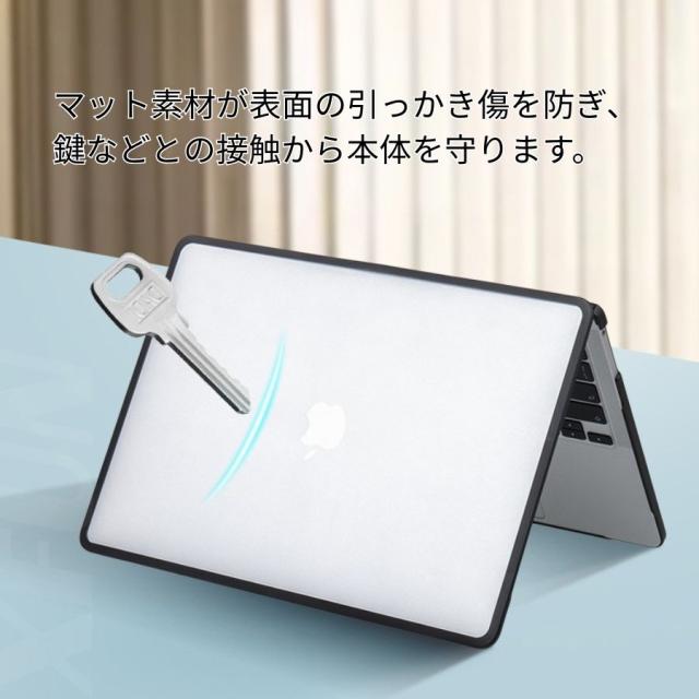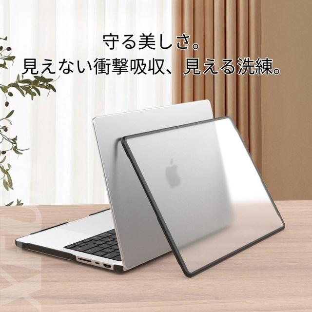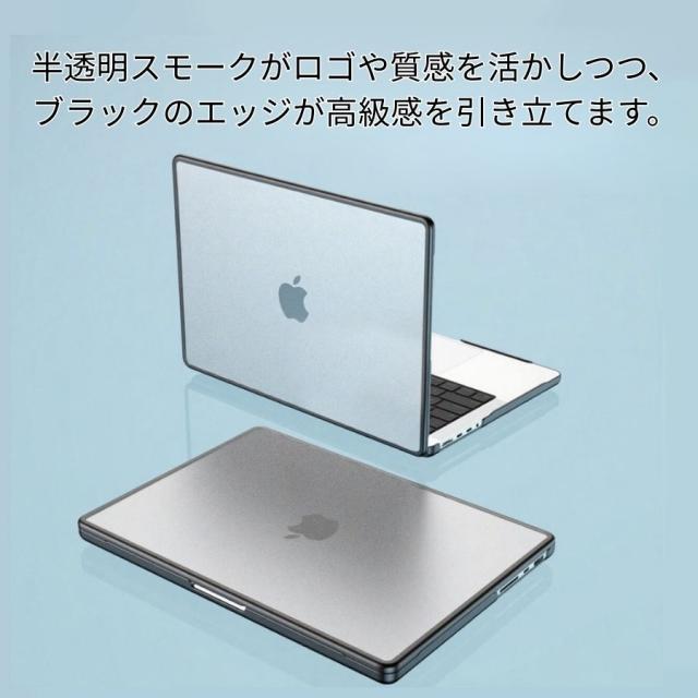 【スタイリッシュな外観】半透明スモークがMacBookのロゴや質感を活かしつつ、ブラックのTPUエッジが高級感を引き立てます。