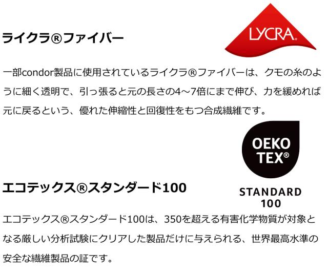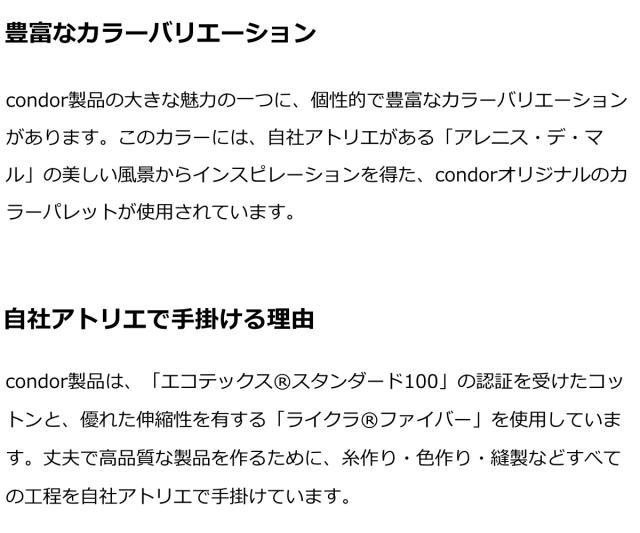 Condor コンドル(スペイン)1898年にスペイン・バルセロナで設立されたARETEX社。創業以来120年以上に渡り高度なニットの成型編み技術とハイテクを駆使し、品質・妥協を許さない姿勢を貫き、年間およそ500万足以上のタイツ・ソックスを生産。最高品質の靴下・タイツメーカーとして世界中に数多くの愛用者を増やし続けています。良質にこだわり、糸作りを含めた全てを地中海沿いの自社工場にて生産しています。肌触りのよさが魅力で、秋冬はもちろんシーズンを通して親しまれる定番アイテムです。