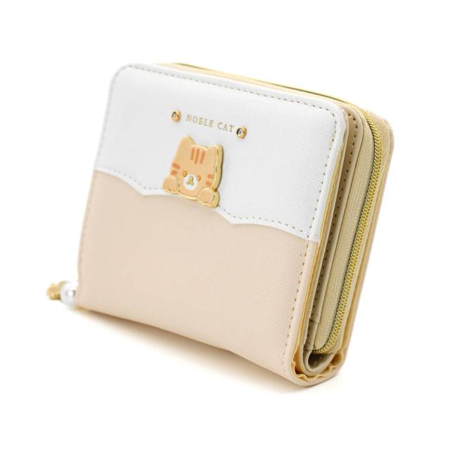 ひょっこりと顔を覗かせる三毛猫のプレートが愛らしい、バイカラーデザインの二つ折り財布です。