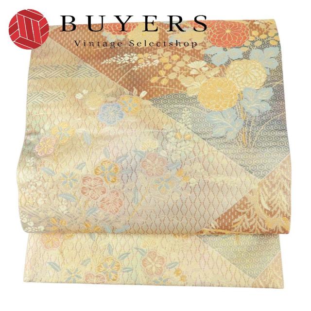 | 品名 | 中古 袋帯 吉祥文様 正絹(金銀糸除く) ゴールド マルチカラー 礼装 渡り橋草花文 お祝い レディース 女性 |
