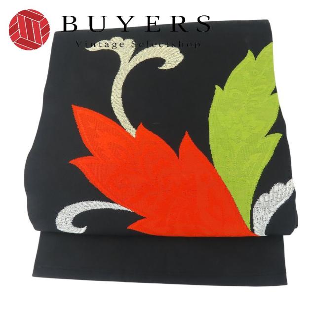 中古 名古屋帯 九寸 名古屋仕立て 正絹(金銀糸除く) ブラック ゴールド レッド グリーン お太鼓柄 大柄葉模様 お洒落 和装 呉服 和服 きもの レディース 女性