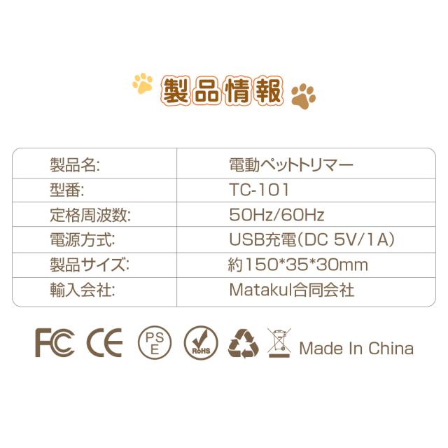 切れ味の良い刃を使用し、毛を引っ張らずスムーズにカット。 刃先は丸み加工で、ペットの肌を傷つけにくく安心。 初心者でも失敗しにくいペット バリカンです。 【USB充電式・コードレス】 USB充電式で、場所を選ばず使える電動バリカン。 コードレスなので取り回しが良く、細かい部分もラクにトリミング。 フル充電で長時間使用可能です。