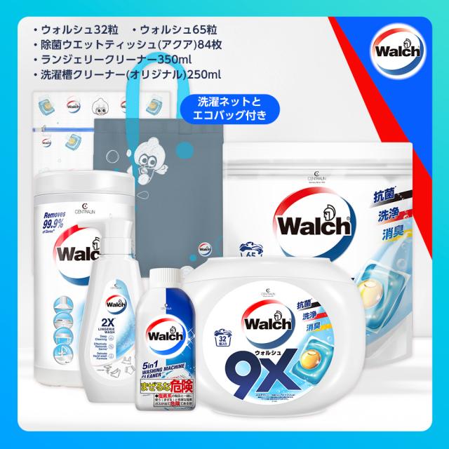 【抗菌ケアプレミアムセット】柔軟剤入り洗濯洗剤 ウォルシュ 本体32粒 詰替65粒 除菌ウエットティッシュ84枚 ランジェリークリーナー350ml 洗濯槽クリーナー250ml まとめ買い 洗濯ネット エコバッグ付き
