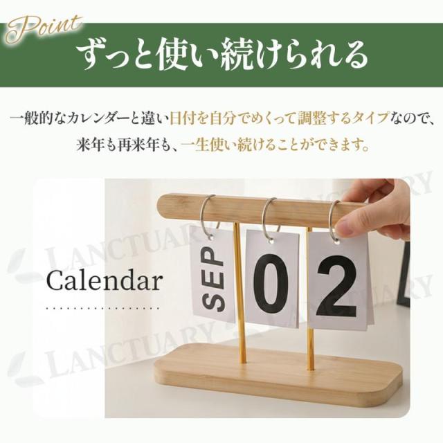 日付を自分でめくって調整する万年カレンダー。来年も再来年も一生使用することができます。
