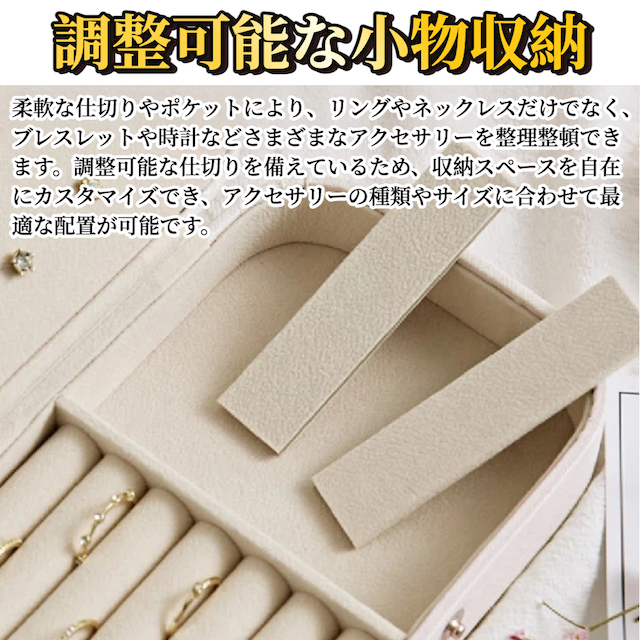 柔軟な仕切りやポケットにより、リングやネックレスだけでなく、ブレスレットや時計などさまざまなアクセサリーを整理整頓できます。調整可能な仕切りを備えているため、収納スペースを自在にカスタマイズできます。/PC321/7-321-2603181704.jpg)