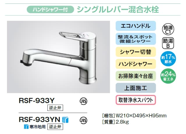 LIXIL シングルレバー混合水栓 RSF-933Y/933YN リクシル INAX イナックス ハンドシャワー付 ワンホールタイプ キッチン水栓 エコハンドル 省エネ 上面施工 一般地用 寒冷地用 水栓金具