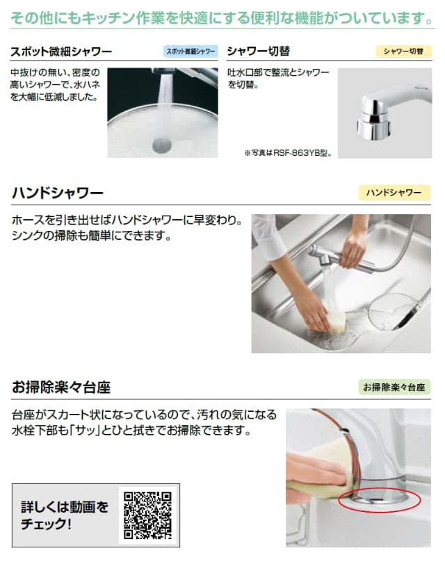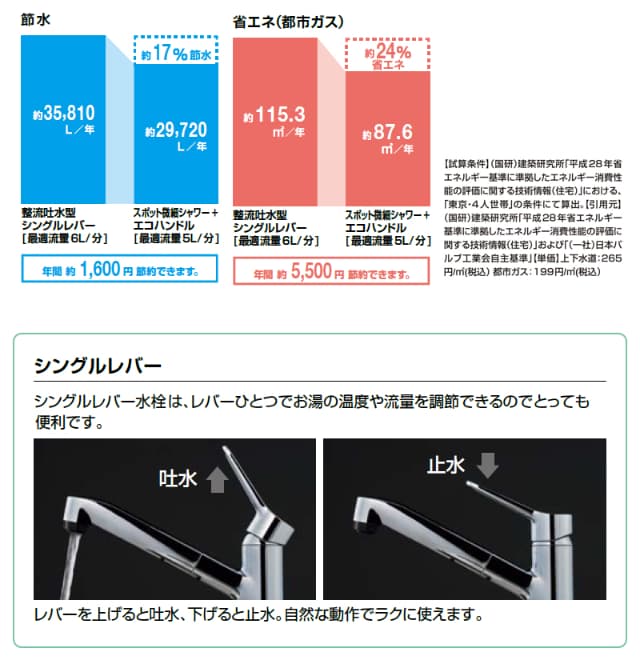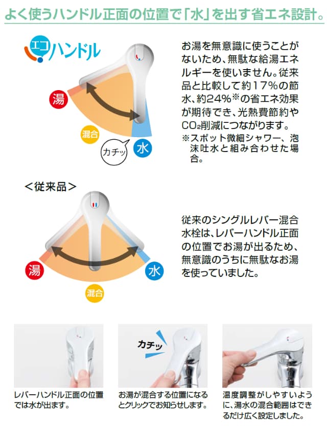 - よく使うハンドル正面の位置で「水」を出すエコハンドルで省エネ。