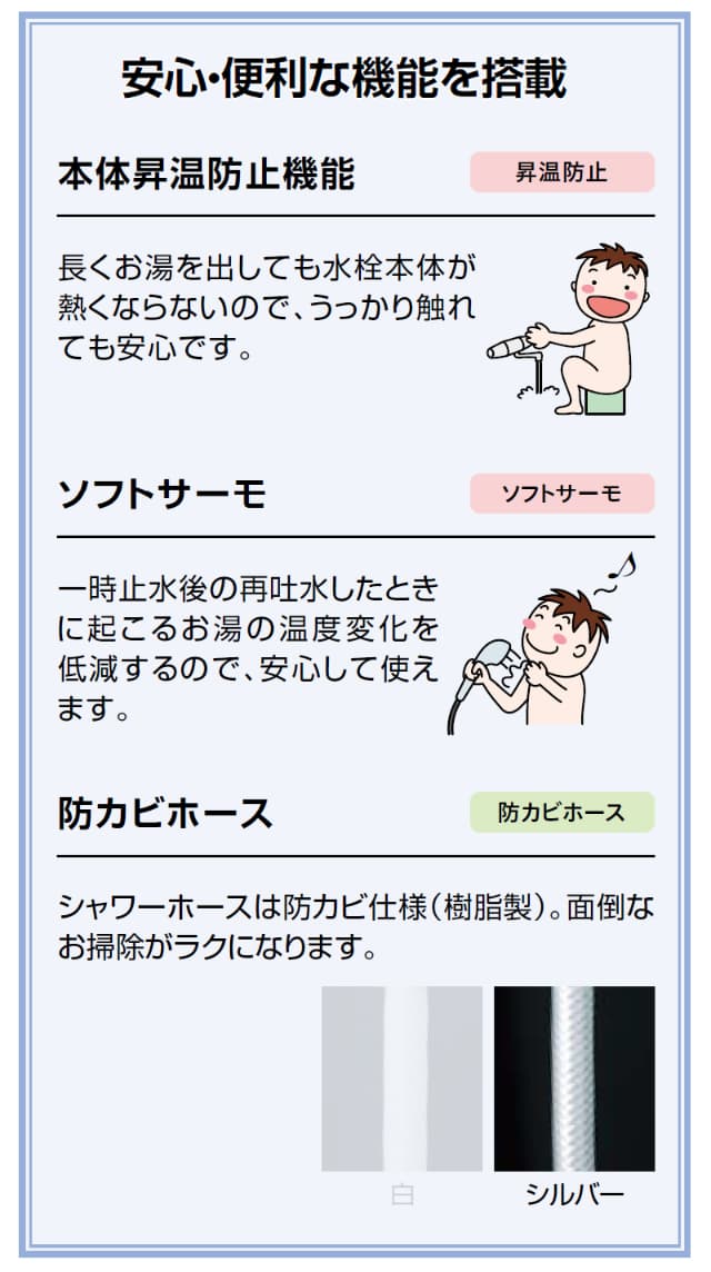 - 一時止水後のお湯の温度変化を低減するソフトサーモ。
