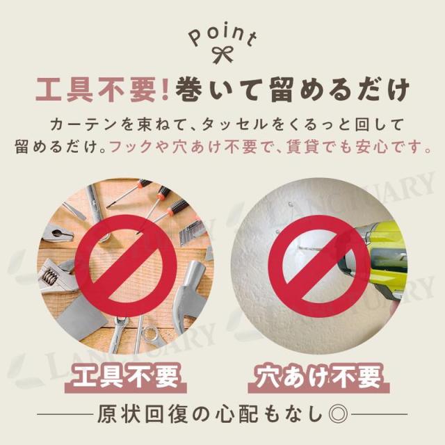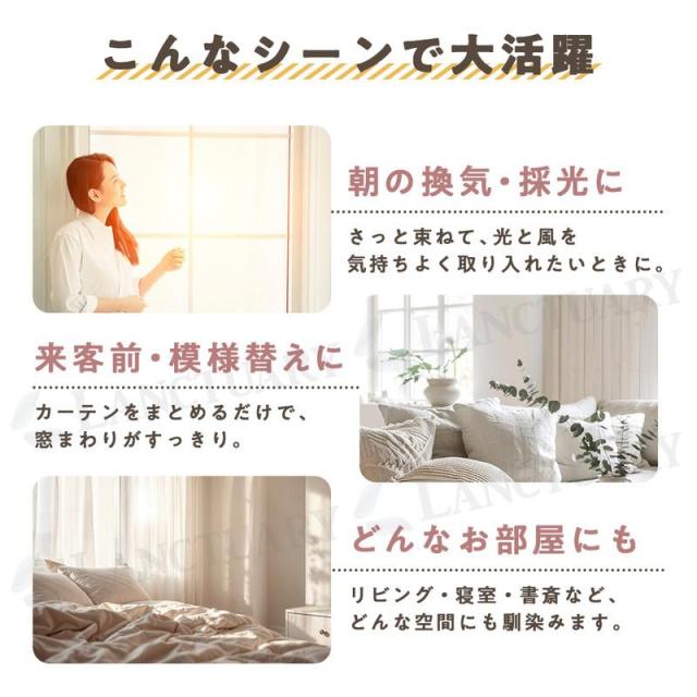 使い方は、カーテンを束ねてタッセルをくるっと巻き付けるだけ。工具や金具、穴あけが不要なロープタイプなので、賃貸住宅でも安心して使えるカーテン留めです。ビーズが連結された構造で、カーテンの厚みや束ね方に合わせてしなやかにフィットし、生地を傷めにくく跡もつきにくい仕様。