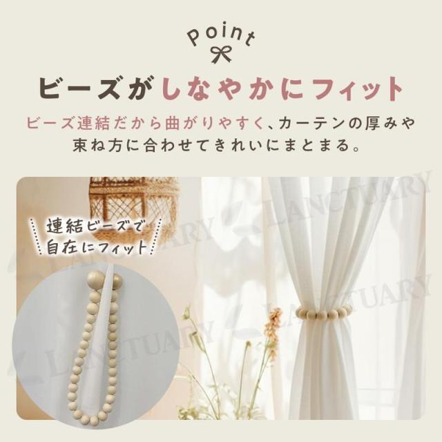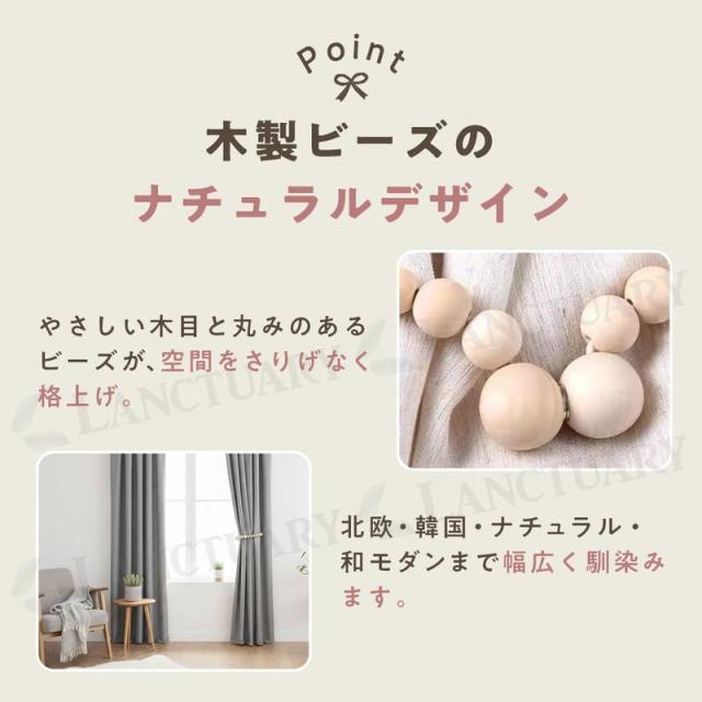 丸みのある木製ビーズと落ち着いたベージュカラーが、北欧・ナチュラルテイストの空間に自然に馴染みます。主張しすぎないシンプルでおしゃれなデザインは、リビングや寝室など幅広いお部屋におすすめです。