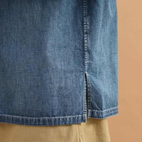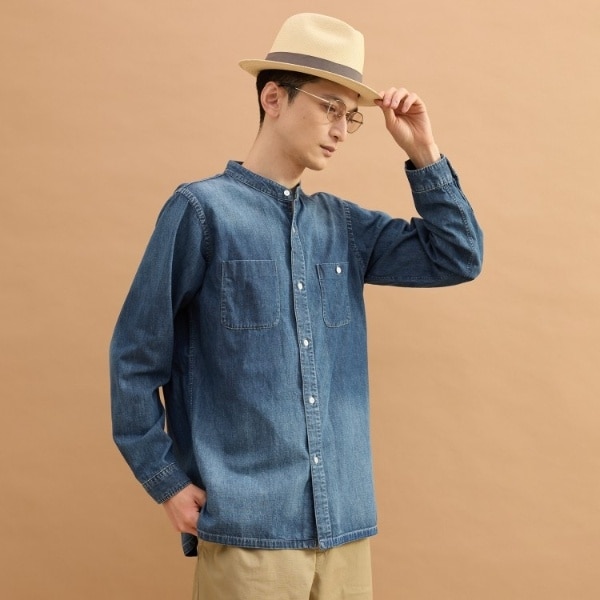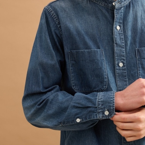 やや長めの着丈でスソを出して着ていただくバンドカラーデニムシャツ。