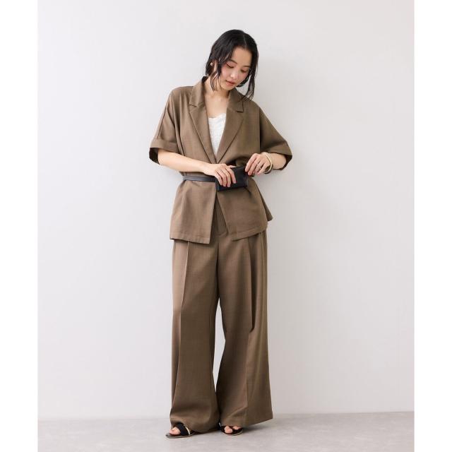 オフィスカジュアルではとセットアップでお作りしているジャケット合わせがおすすめです。セットでの着用ですとインナーをカジュアルなものに落とし込んでも決まりやすいです。また、素材感がカジュアル合わせにも取り入れやすい素材感です。