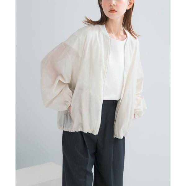 オーガンジー特有の繊細な透け感に光沢加工を施した、上品なツヤ感を持つ素材を使用。薄手で軽いながらも適度なハリがあるため、ふんわりとした立体的なシルエットをキープし、シワにもなりにくいのが魅力です。シアー素材なので程よい抜け感もあり、Tシャツやデニムといったカジュアルなアイテムに合わせるだけで、洗練されたトレンドスタイルが完成。ミニマルなデザインとパターンが、カジュアルなブルゾンを高級感のある大人のブルゾンに格上げしてくれる1枚です。