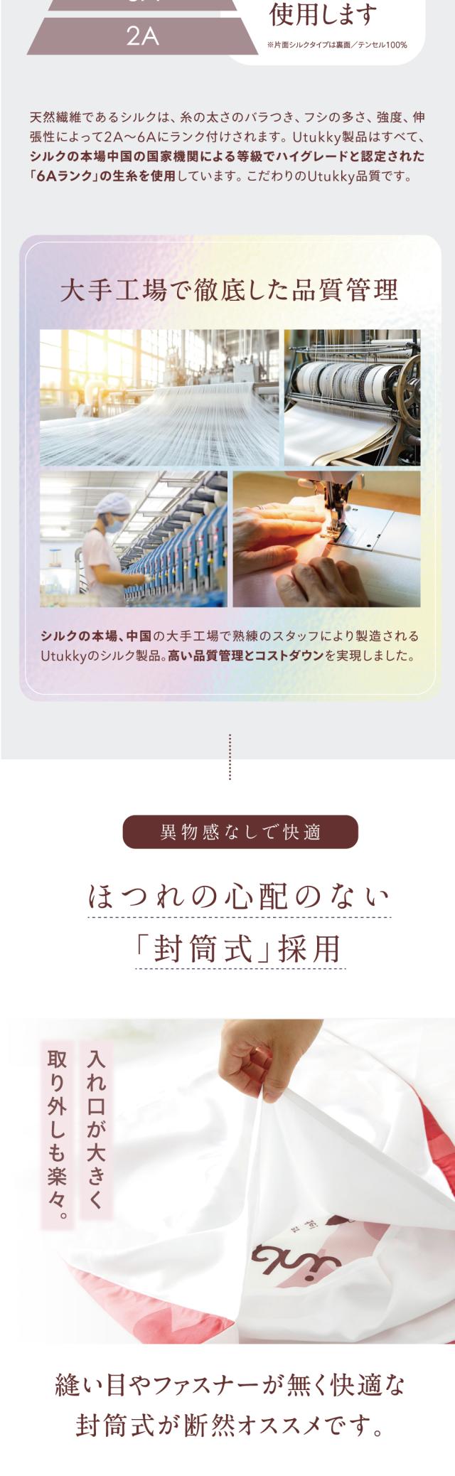 肌に直接触れる表面には、なめらかなシルク100%を使用。裏面には、通気性と吸湿性に優れたテンセルを採用。やさしい天然素材の組み合わせが、快適な睡眠環境をつくります。