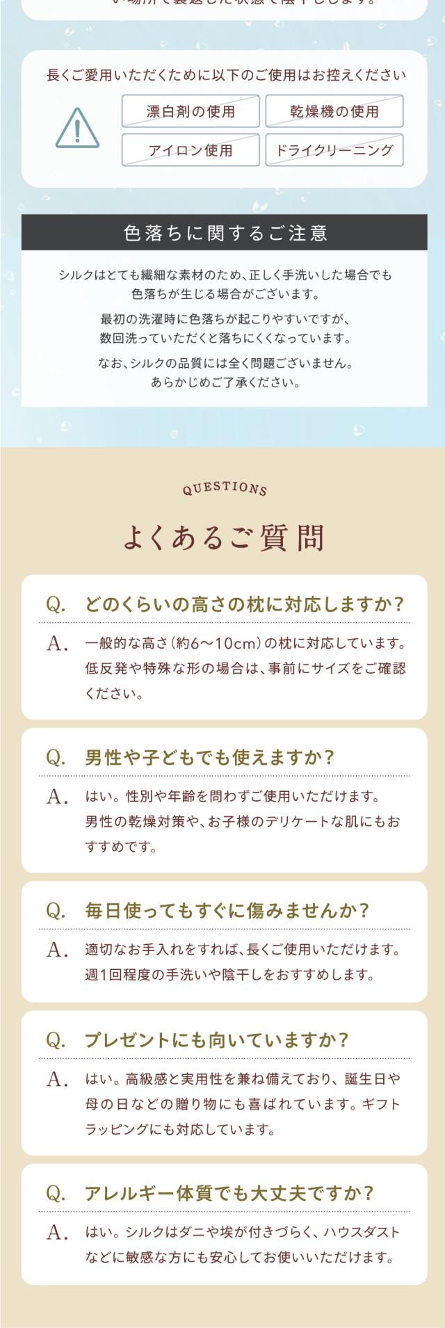 | お手入れ方法 | シルク100%のため、手洗いをしてください。 (1)ぬるま湯(30℃以下)に中性洗剤を溶かし、やさしく押し洗いしてください。 (2)洗剤が残らないよう、きれいな水でやさしくすすぎます。 (3)軽く押さえるようにして水気を取り、タオルに包んで軽く水分を吸い取ります。 (4)直射日光を避け、風通しのよい日陰で平干ししてください。 (5)必要な場合は当て布をし、低温(110℃以下)で軽くアイロンをかけてください。 |