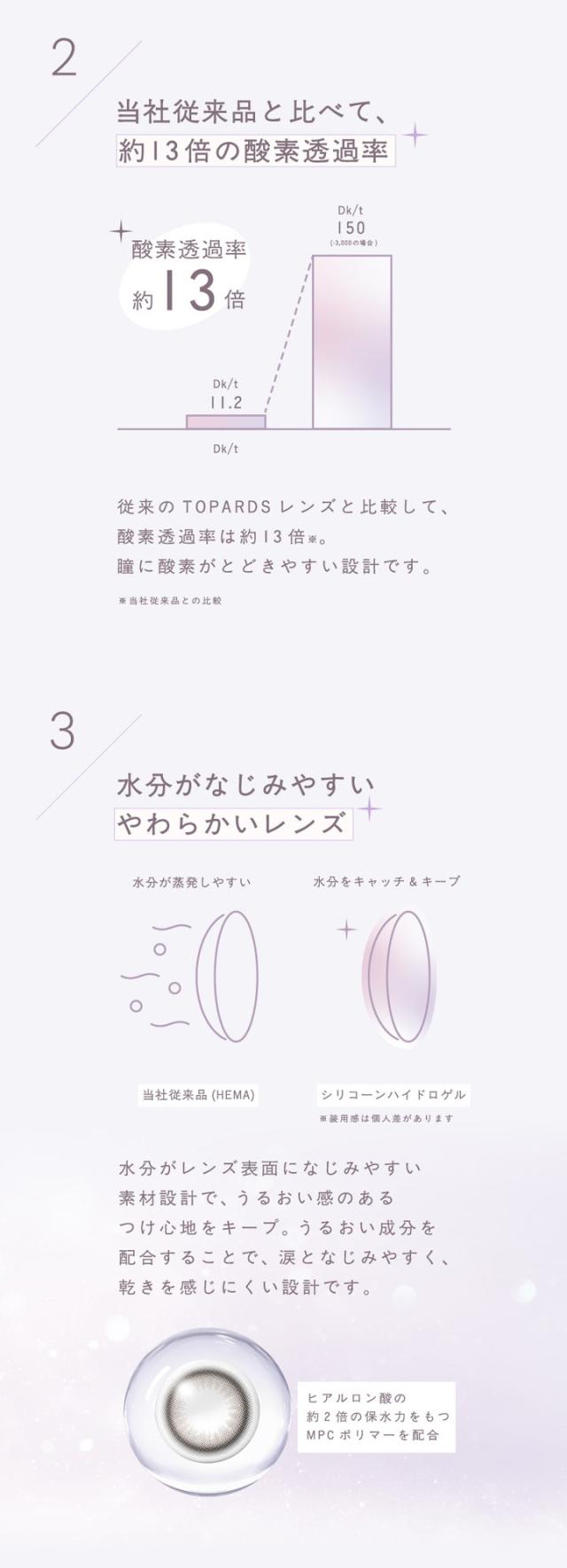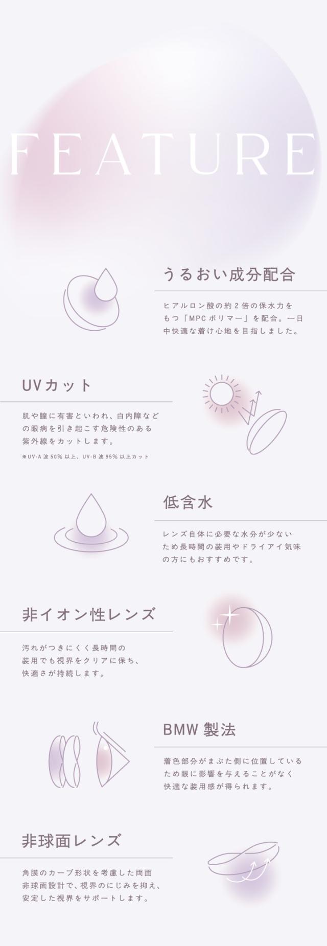 ■特徴:UVカット(UV-A波 50%以上、UV-B波 95%以上カット)、潤い成分(MPCポリマー)配合、シリコーンハイドロゲル素材