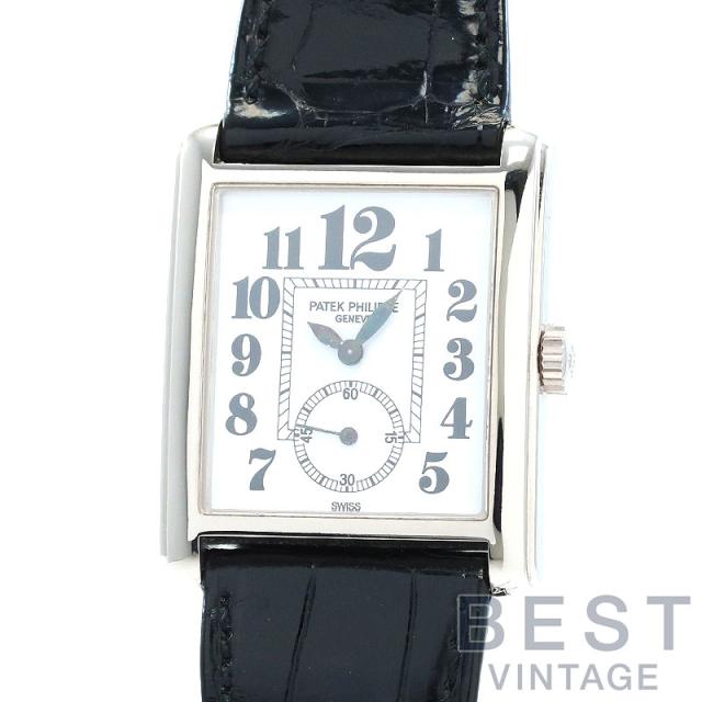 ブラジルの高級時計宝飾店ゴンドーロ&ラブリオ社のために、1902年から1927年にかけて製造されていた「クロノメトロ・ゴンドーロ」を起源とするパテックフィリップの人気モデル「ゴンドーロ」。アール・デコ様式を基調とした直線的デザインの美しさが特徴的なタイムピースです。「Ref.5014G-010」は約35mm×約27.5mm径のホワイトゴールド製ケースに、レトロなアラビア数字インデックスを備えたホワイトダイヤルを組み合わせたタイムピースとなっております。当店オーバーホール済み。
