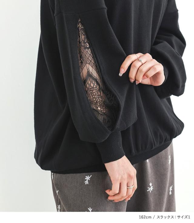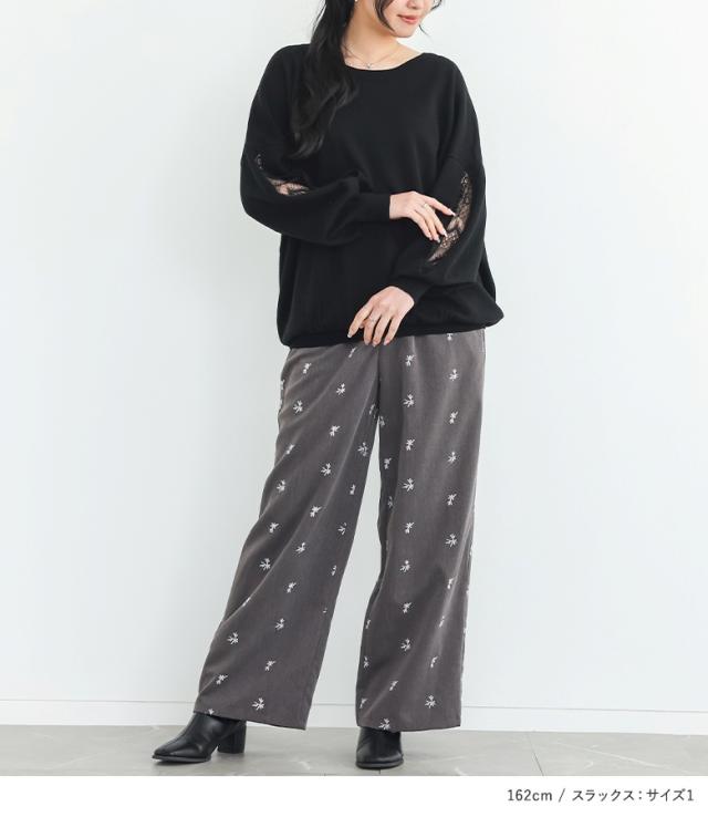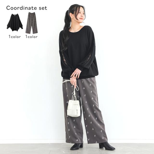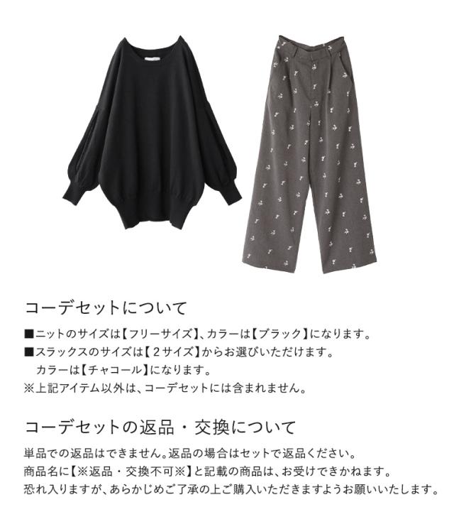 『スラッシュスリーブレースニット×花柄刺繍スラックスコーデ2点SET』【メール便不可】【30】[2点コーデセット 2026 レディース トップス ニット セーター ショート丈ニット パンツ スラックス ワイドパンツ 花柄]