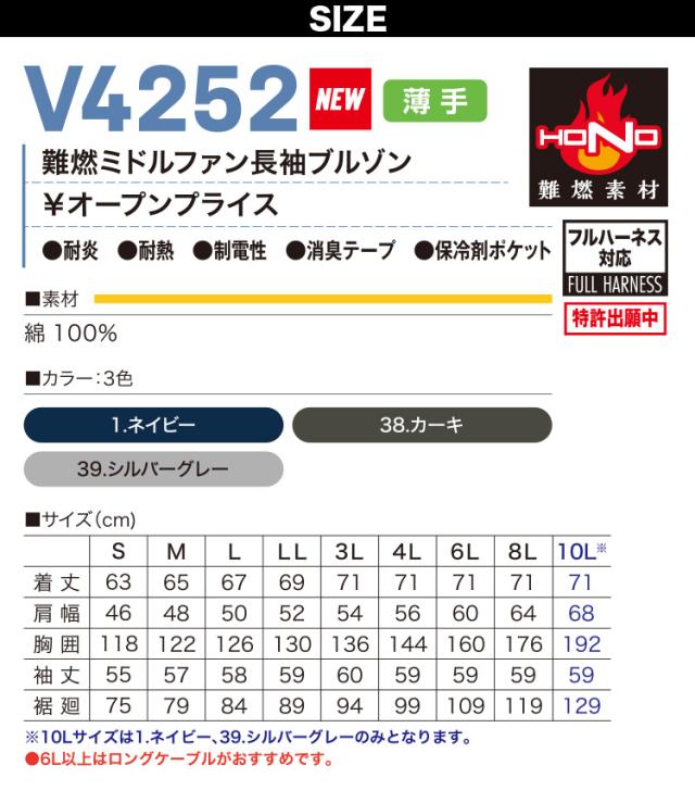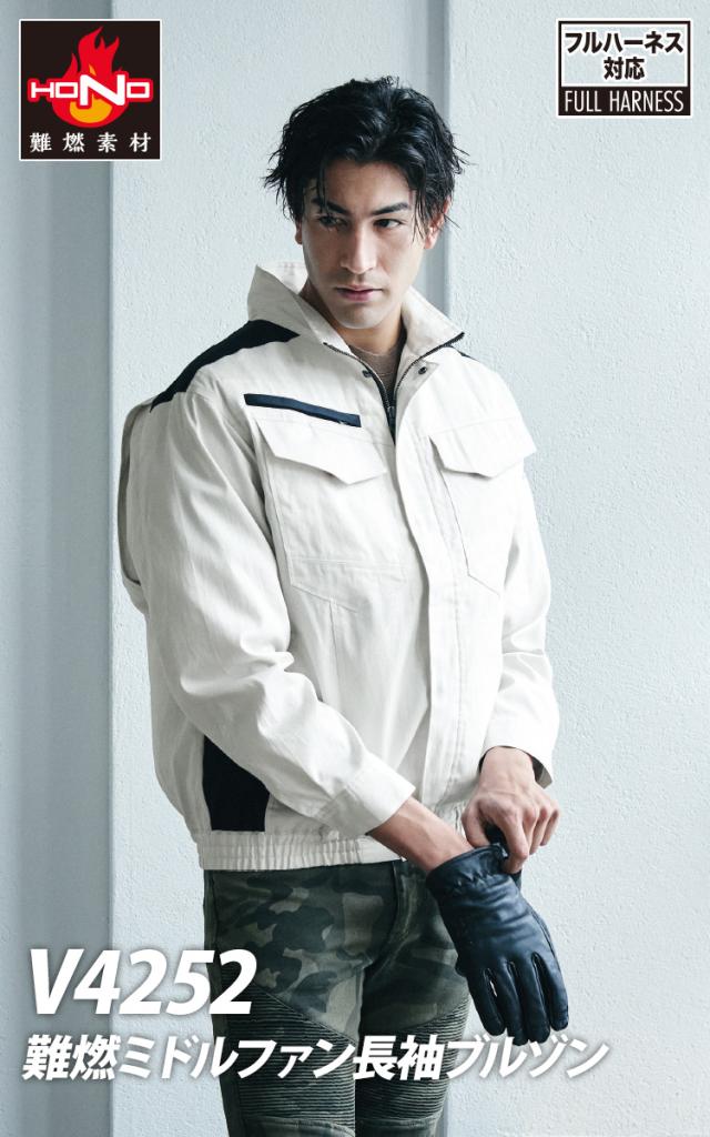 村上被服 HOOH V4252/V3001/V3002 難燃ミドルファン長袖ブルゾン 2026年新型 30Vファンバッテリーセット 難燃素材 耐炎 耐熱 制電性 消臭テープ フルハーネス対応 春夏薄手作業服 空調作業服 ファン付き作業服