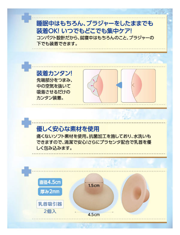 【内容量】2個入り【使用方法】本品の吸着効果を高めるために、市販のワセリンクリームやローションを塗布してください。本品を乳頭部に当てます。先端部分をつまみ、中の空気を抜いて吸着させます。※最初は短時間のご使用でお試しください。※再使用時は水洗いをし、よく乾かしてからご使用ください。【使用上の注意】※使用中に皮膚に異常を感じたときは使用を中止してください。※炎症や外傷がある場合は使用しないでください。※使用後は水洗いし、よく乾かしてから保管してください。※乳幼児の手の届かないところへ保管してください。【材質】スチレン系エラストマー【区分】雑貨【製造国】日本
