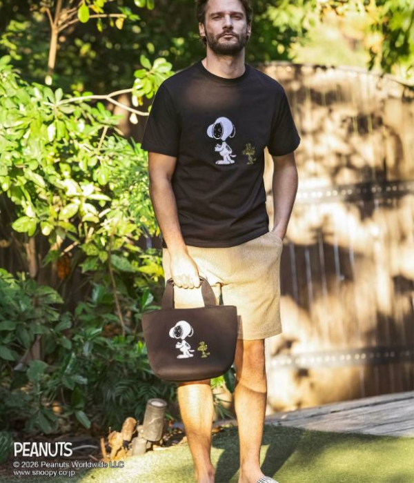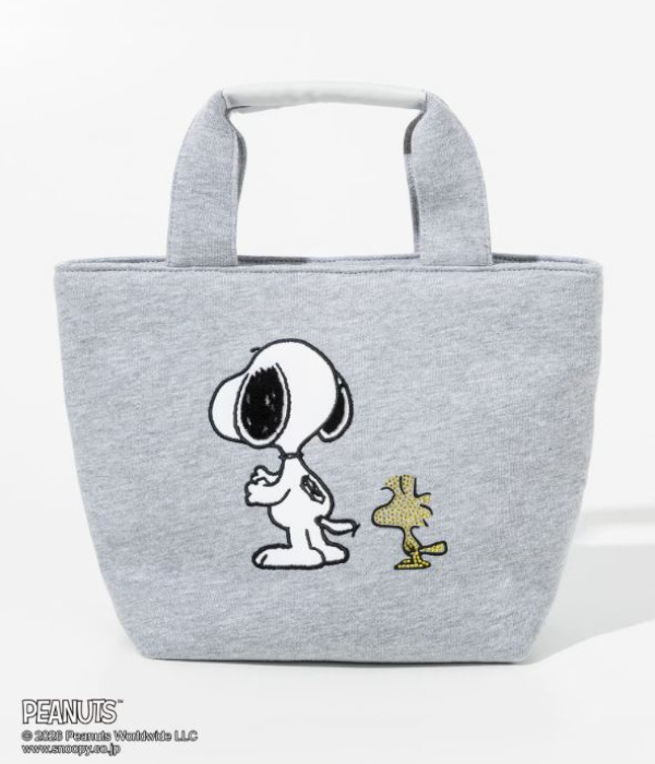 スヌーピーとウッドストックの仲睦まじいグラフィックを配置したスウェット素材のミニバッグ。