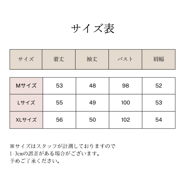 すべて平置きサイズです(採寸方法違いより、多少の誤差がございますので、ご了承ください)。