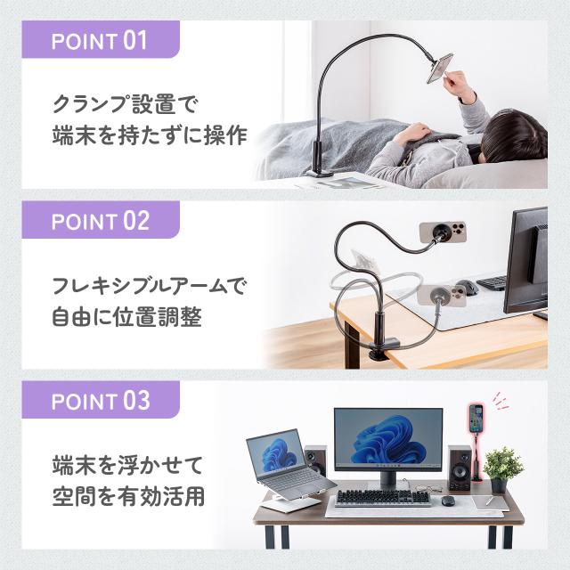 スマホホルダー フレキシブルアーム MagSafe対応 マグネットリング付属 自由自在 スマホアーム クランプ固定式 デスクサイド ベッドサイド 寝ながら 360度回転[200-STN100BK]