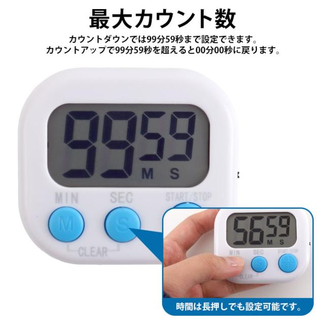 99分59秒まで設定でき、「00:00」になると約30秒間アラームが鳴り続けます。