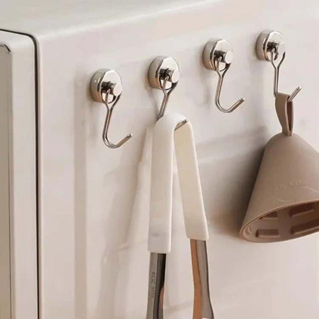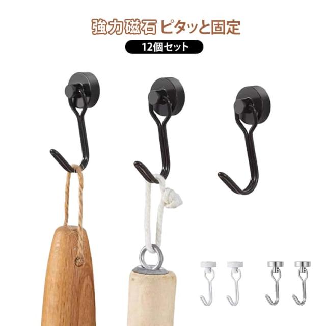 | くっつけるだけで、収納が一気に増える超強力マグネットフック12個セットです。 冷蔵庫・洗濯機・浴室の壁・玄関ドアなど、磁石が付く場所ならどこでも簡単設置して、工具不要・穴あけ不要で、すぐに収納スペースが完成します。 フックの可動域が180度で吊り下げも横掛けも自由自在にアレンジできるマグネットフックです。 フライパンやお玉などのキッチン用品や、小さめの観葉植物や絵画など、吊るしたいけど落としたくない!そんな望みを叶えます。 | |