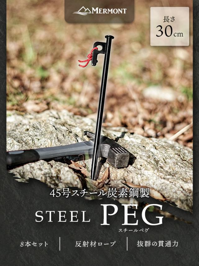 スチールペグ 30cm 8本セット 防錆コーティング 反射ロープ付 収納袋付き キャンプ テント タープ アウトドア 送料無料 MERMONT WEIMALL