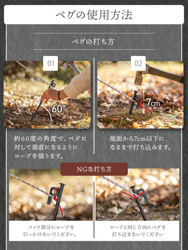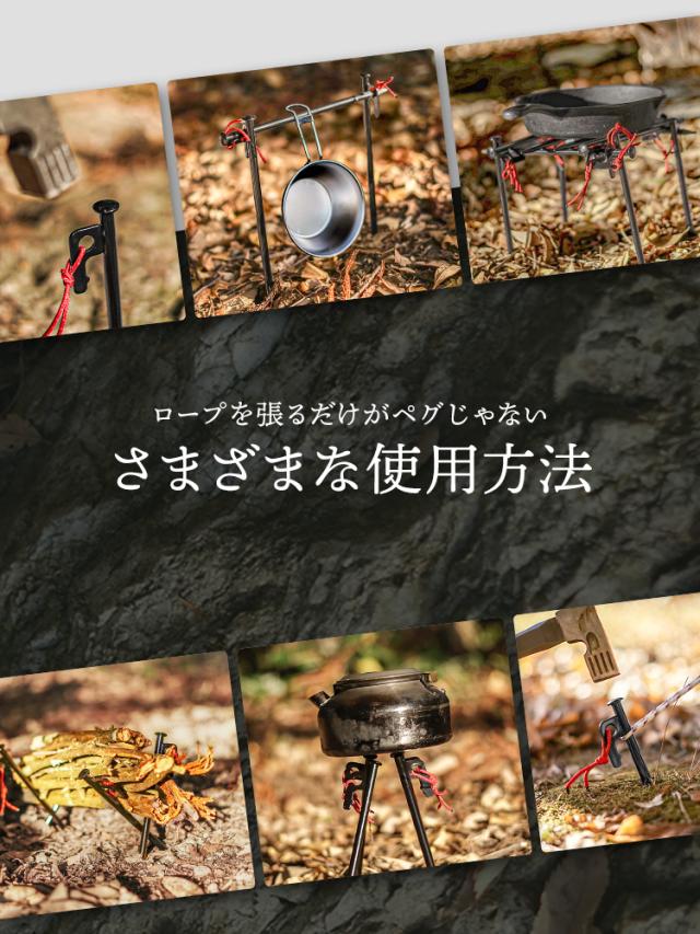 キャンプ、アウトドア、タープ固定、テント設営など、あらゆるシーンで活躍する頼れるペグセットです。